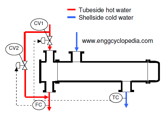- 壳侧冷水的出口温度可能会因热和冷侧流量比的比率而变化。因此,要维持相同的管侧出口温度,该流量比需要保持相同。由于管侧的流量超过了要求,因此仅需要部分流向交换器管侧,而休息可以绕过交换器。交换器壳体插座上的温度控制器(TC)防止控制阀(交换器示意图中的CV1)调整热水的比例来交换管侧。