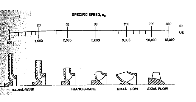 一般而言,随着特定速度的数量增加,叶轮的大小从径向叶片的形状(在美国规模的500到1,000之间)到轴向流动形状(对于美国规模的10,000至20,000之间)。右侧的叶轮比左侧附近的叶轮更有效。