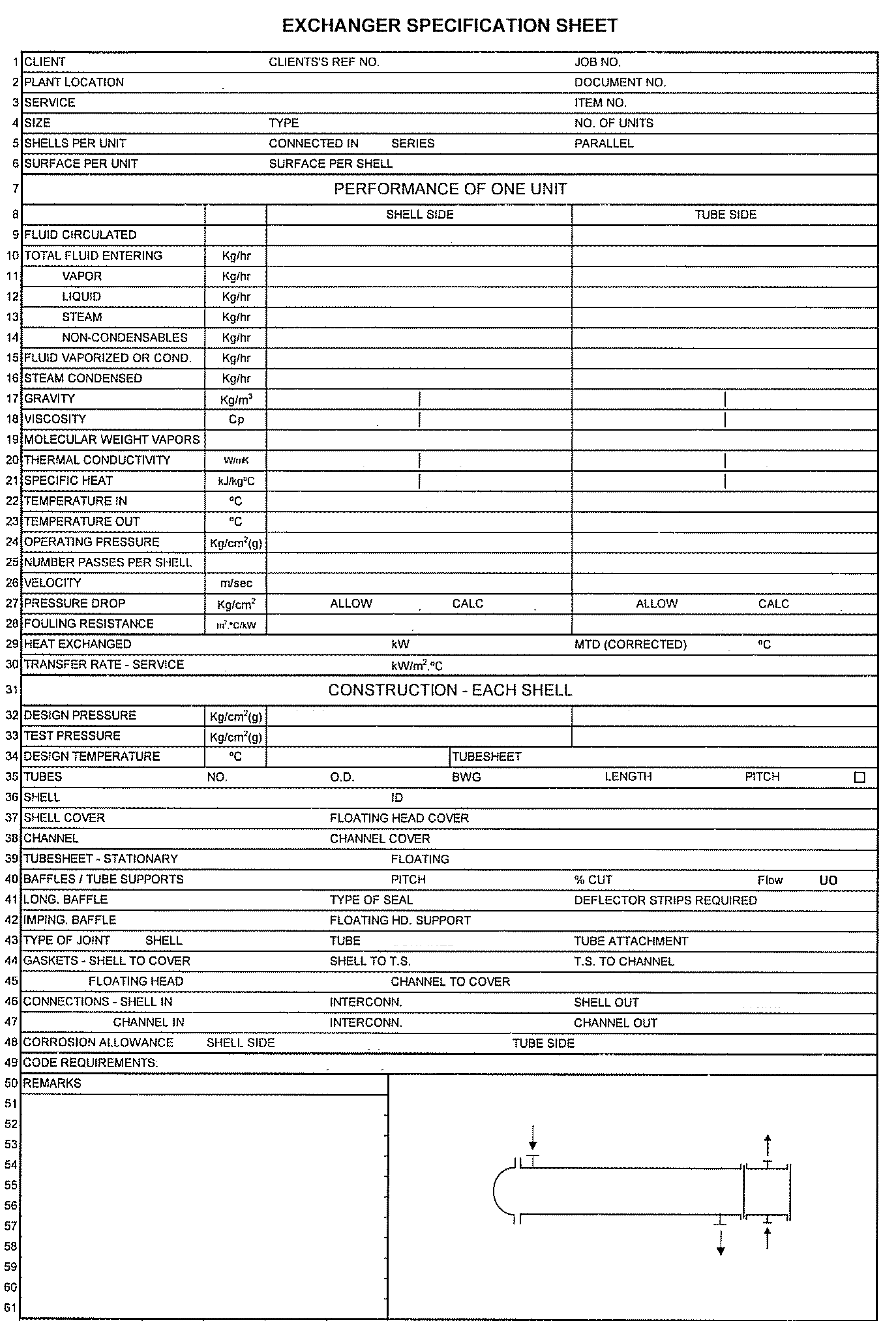 When ordering for manufacturing of ashell & tube heat exchanger,the Client shall provide the Manufacturer a specification sheet for that shell & tube exchanger. The contents of a typical specification sheet of heat exchanger are as following: