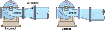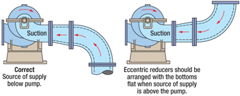 您可以通过安装来避免这些问题泵吸入口的偏心减速器而不是同心圆。