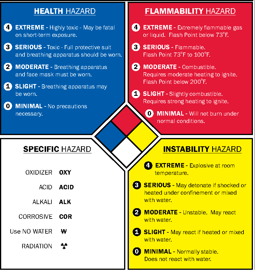 蓝色表示健康危害的水平,红色表示易燃性危害,黄色的化学反应性危害,而白色包含特殊类型的危险的特殊代码。所有四(4)个危害的额定级为0(涉及最小危险)至4(涉及极端危害)。