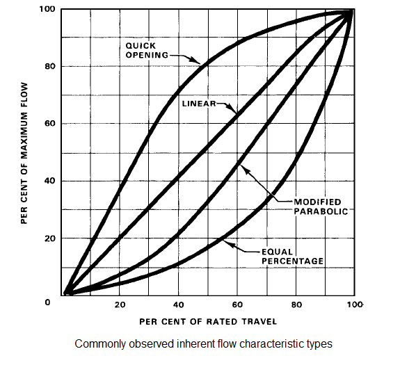 - Modified parabolicvalves lie somewhere between the linear valves and equal percentage valves. As can be observed in the following figure, they can be used for throttling at low flow levels and have almost linear characteristics at higher flows.